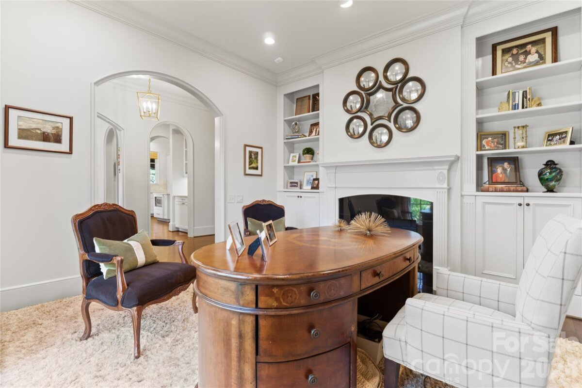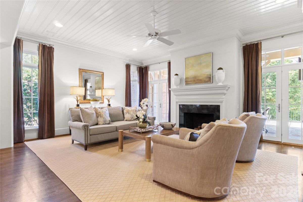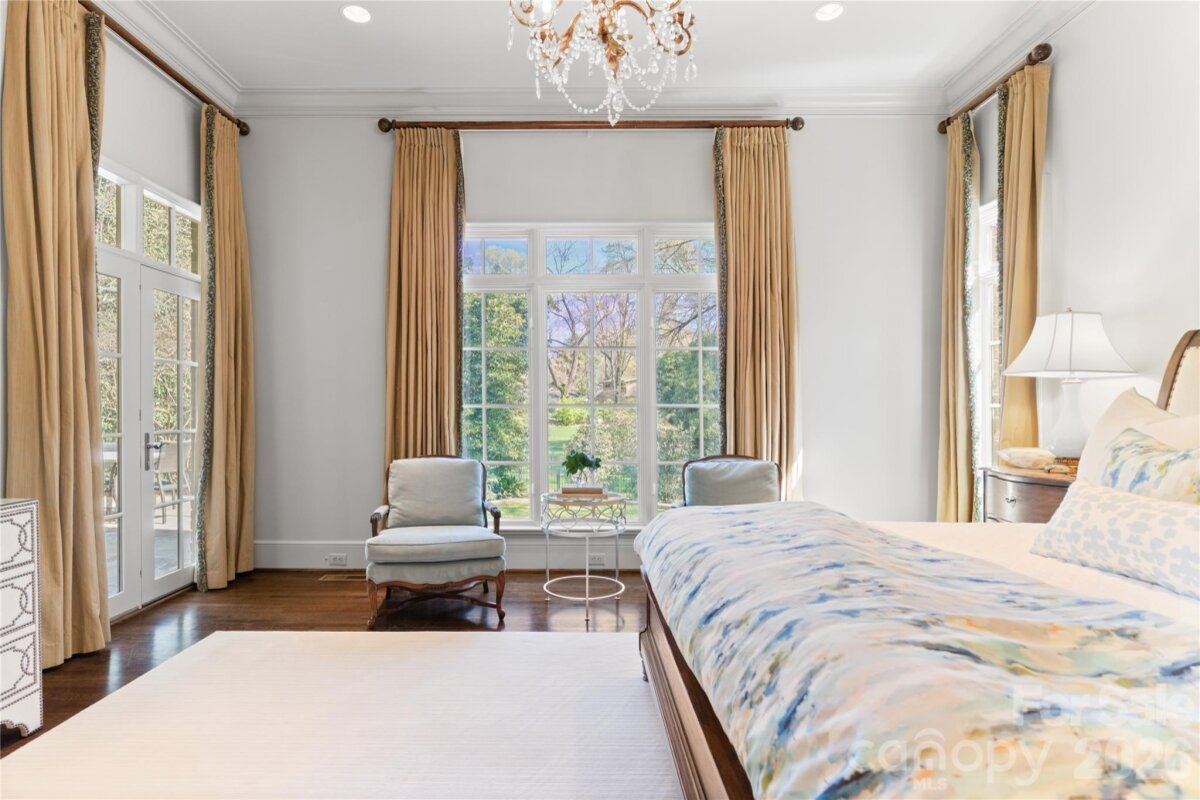 Located on .49 acres in the beautiful Myers Park neighborhood, this 5 bedroom home combines charm with functional design—built for entertaining and daily living. 10-foot ceilings on the main level and 9-foot ceilings upstairs create an open, spacious feel throughout. The recently updated chef's kitchen features Taj Mahal quartzite countertops and premium appliances including Thermador double ovens, Sub-Zero refrigerator, Sub-Zero wine fridge, and Bosch dishwasher. Two bar areas and an open layout to the family room provides effortless hosting. The downstairs primary bedroom includes heated bathroom floors, separate walk-in closets, and washer/dryer connections with direct access to the private terrace and fenced backyard. Upstairs you'll find three spacious bedrooms, an upstairs laundry room, and a bonus room providing plenty of space for everyone. In addition, the 440-square-foot guest suite above the 2-car garage has a private entrance and full bath—ideal for visitors, a home office, or multigenerational living. The covered terrace features a gas fireplace, Weber grill connected to a built-in gas line, and overlooks a gorgeously landscaped fenced yard. A large circular driveway with porte-cochère offers easy loading and unloading. Recent updates include: new HVAC systems (2018, 2024), crawlspace encapsulation (2023), fresh paint interior (2022) and exterior (2020). This home is well-maintained, move-in ready, and conveniently located to excellent schools, Myers Park Country Club, upscale retail and dining.