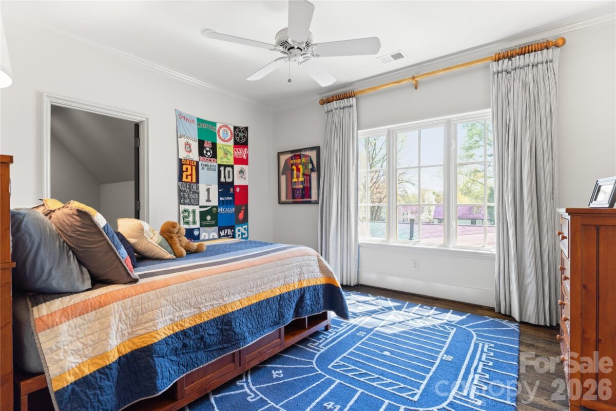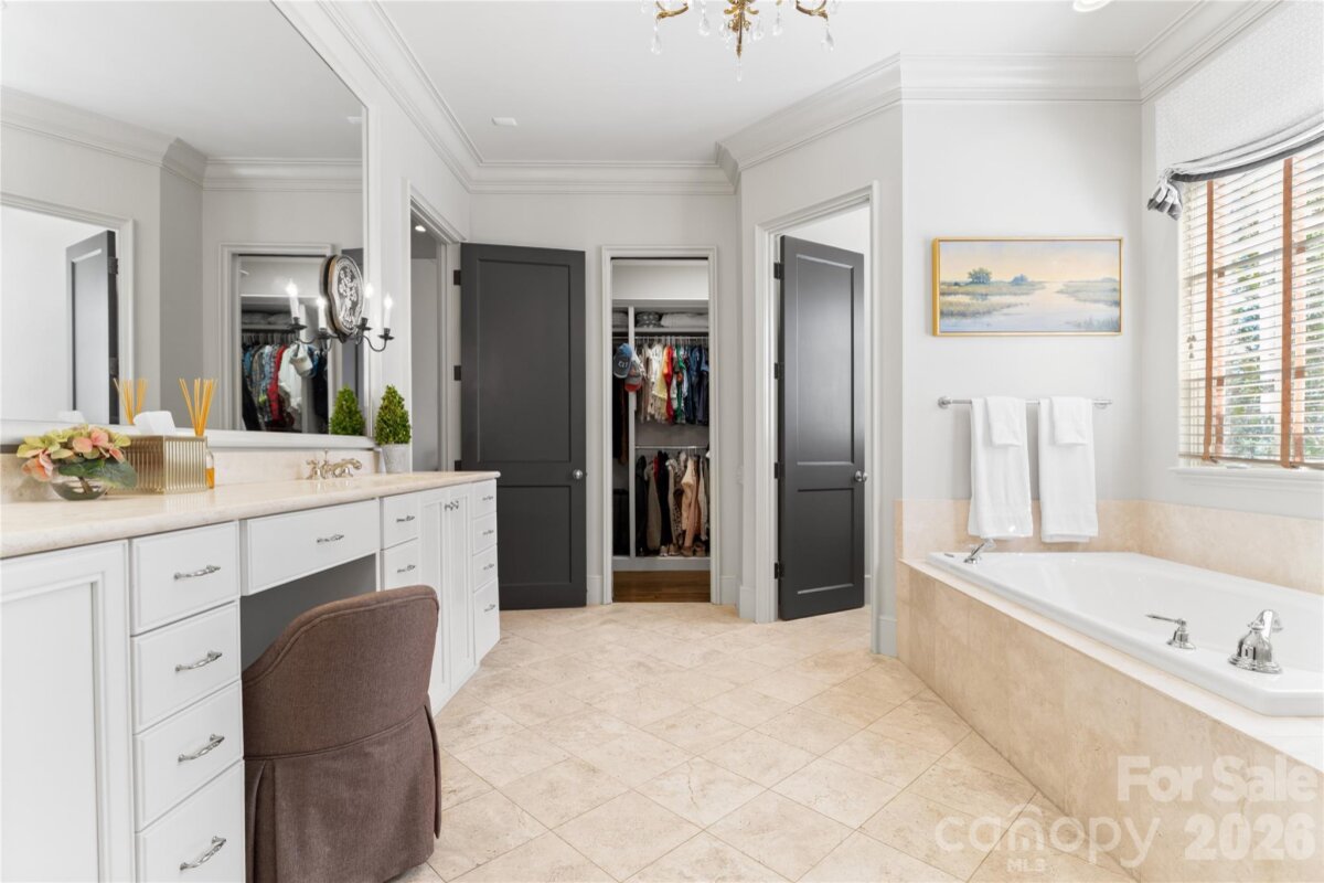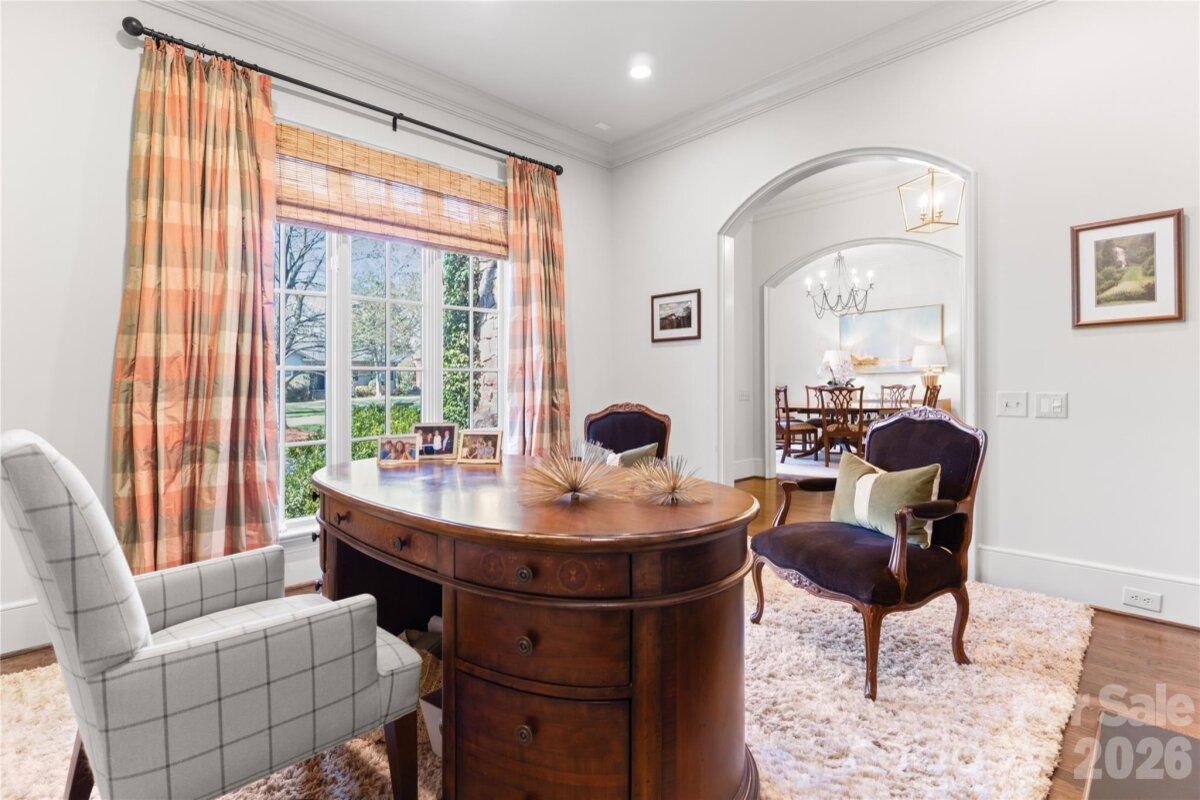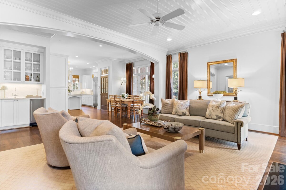 Located on .49 acres in the beautiful Myers Park neighborhood, this 5 bedroom home combines charm with functional design—built for entertaining and daily living. 10-foot ceilings on the main level and 9-foot ceilings upstairs create an open, spacious feel throughout. The recently updated chef's kitchen features Taj Mahal quartzite countertops and premium appliances including Thermador double ovens, Sub-Zero refrigerator, Sub-Zero wine fridge, and Bosch dishwasher. Two bar areas and an open layout to the family room provides effortless hosting. The downstairs primary bedroom includes heated bathroom floors, separate walk-in closets, and washer/dryer connections with direct access to the private terrace and fenced backyard. Upstairs you'll find three spacious bedrooms, an upstairs laundry room, and a bonus room providing plenty of space for everyone. In addition, the 440-square-foot guest suite above the 2-car garage has a private entrance and full bath—ideal for visitors, a home office, or multigenerational living. The covered terrace features a gas fireplace, Weber grill connected to a built-in gas line, and overlooks a gorgeously landscaped fenced yard. A large circular driveway with porte-cochère offers easy loading and unloading. Recent updates include: new HVAC systems (2018, 2024), crawlspace encapsulation (2023), fresh paint interior (2022) and exterior (2020). This home is well-maintained, move-in ready, and conveniently located to excellent schools, Myers Park Country Club, upscale retail and dining.